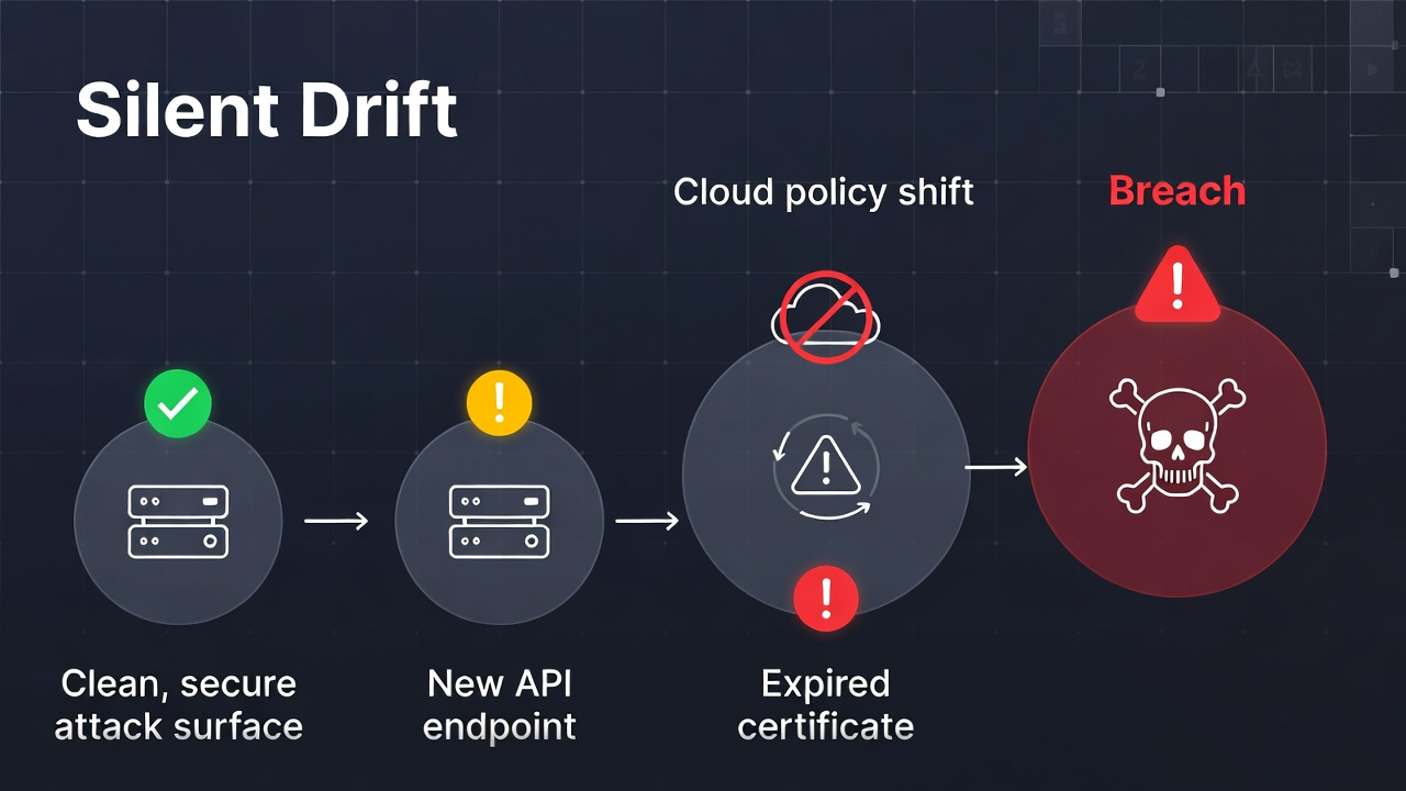 Silent drift is what happens when the outside world changes and your team never notices. It is not the same as "we saw a change and decided to accept it." It is change that occurs externally—new subdomains, new API endpoints, expired certificates, cloud policy shifts, decommissioned assets, or vendor-side updates—without any corresponding internal visibility or response. By the time an incident occurs or an auditor asks what was exposed when, the evidence trail is missing because the organisation was never looking.